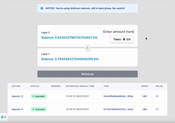 Enter the amount of ETH/tokens you want to bridge over in the “L2” field and then press “withdraw”. Follow the steps on Metamask. After the fraud proof window has closed, press on “claim” and your funds will be available in your wallet!