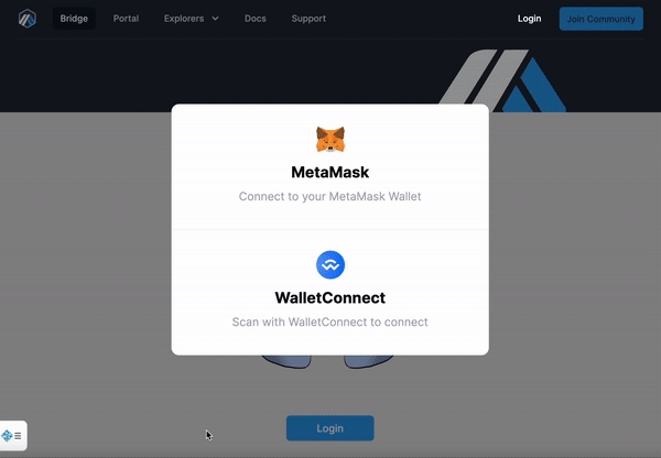 Click the arrow in the middle of the page, then select the token you want to bridge in the drop-down menu.