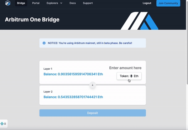 Select the ETH or ERC-20 to bridge in the token drop-down menu.