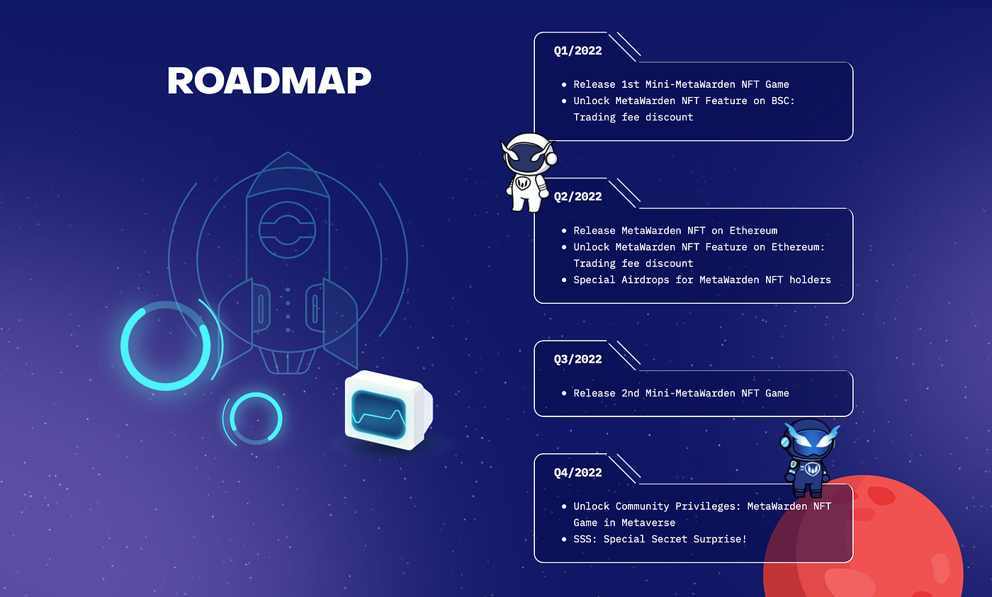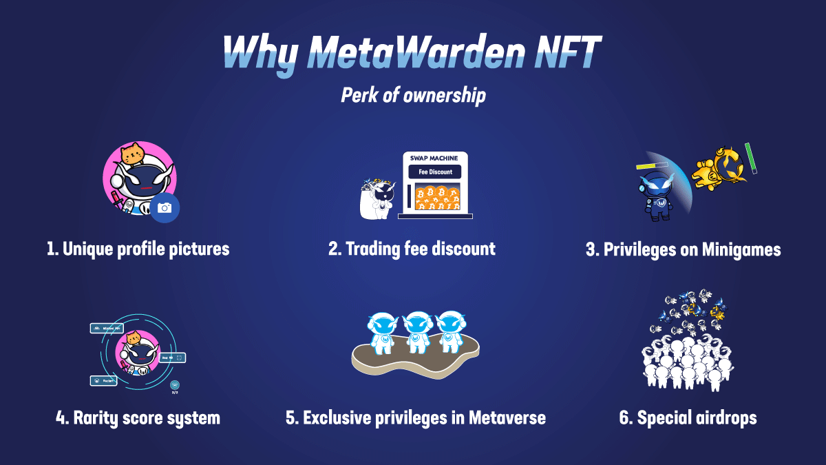 5 Exclusive privileges in Metaverse MetaWarden NFT will be involved on our own and our partners’ Game and Metaverse platforms. Holding MetaWarden will be like a passing ticket to those platforms together with special benefits that will be distributed to holders from time to time.