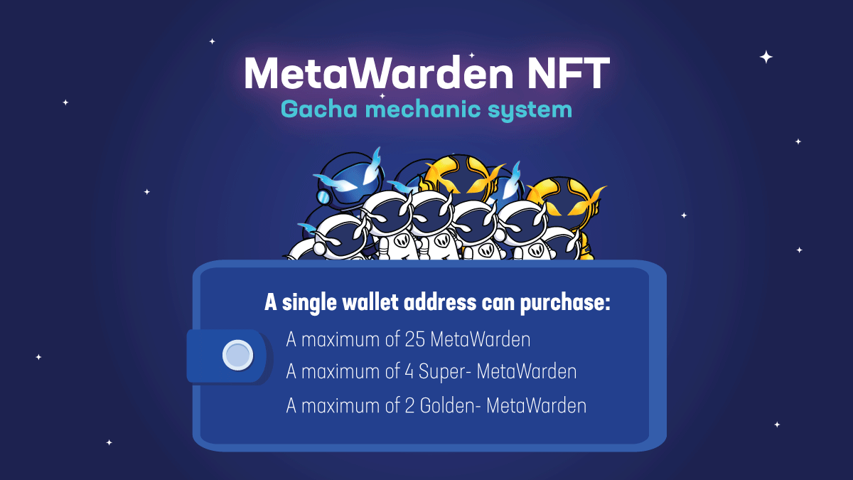 A single wallet address can purchase: A maximum of 25 MetaWarden A maximum of 4 Super- MetaWarden A maximum of 2 Golden- MetaWarden
