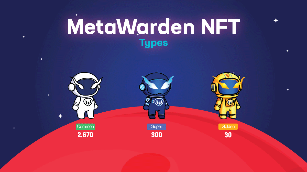 MetaWarden NFTs are divided into 3 types: 2,670 Common- MetaWarden. 300 Super- MetaWarden. 30 Golden- MetaWarden.