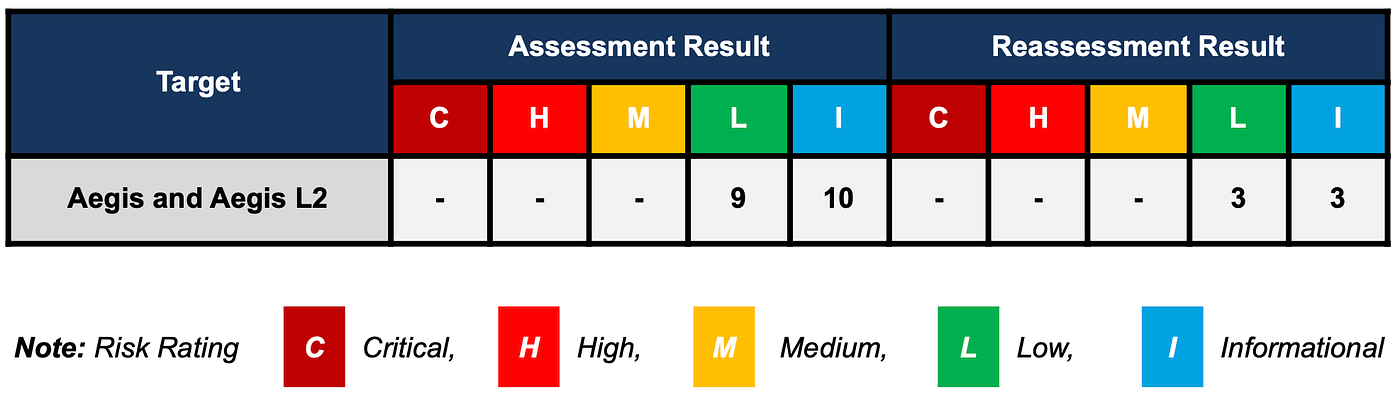 Valix Consulting has found no critical, high, or medium issue on Aegis and Aegis L2 💪. Only nine low and ten informational issues have been found. We already remediate thirteen issues and acknowledged six issues according to Valix experts’ recommendations.