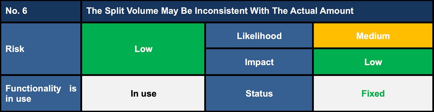 Description: The affected functions do not check the sum of percentage volumes which may lead to an accounting issue when the percentage of split volumes and the actual token amount are unmatched.